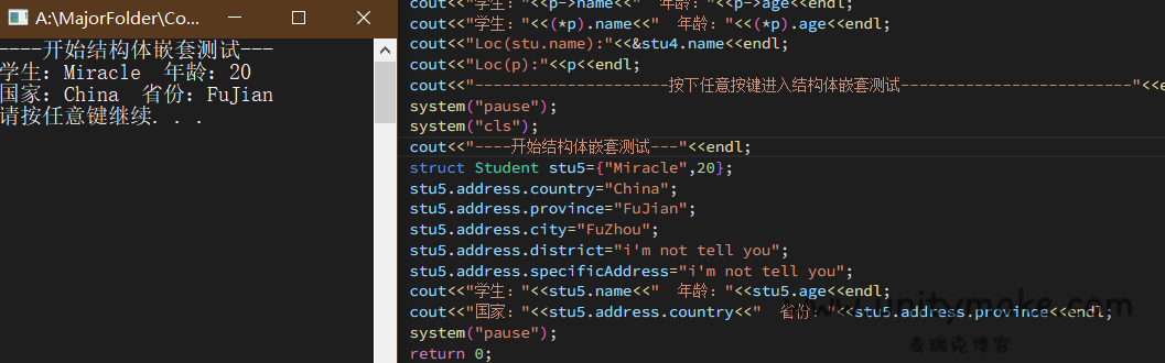 struct Student { string name; int age; }s3;int main() { s3.name="Miracle"; s3.age=20; cout<<"学生:"<<s3.name<<endl<<"年龄:"<<s3.age<<endl; system("pause"); return 0; }