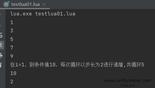 lua 中for也是有三个参数列表 跟c#一样。在lua中 i1,i2,step i1至i2以step作为步长 每次循环完增加step