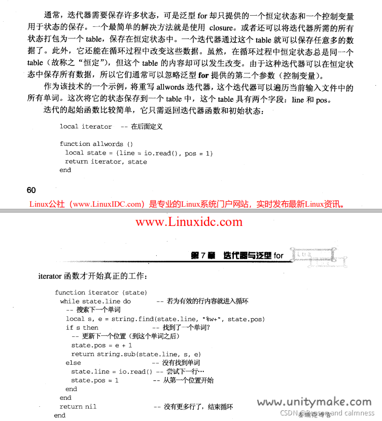 上面迭代单词的示例中使用的是Closure的非局部变量的保存来实现迭代器,在这个示例中我们可以通过参数传值的方式代替Closure的非局部变量。利用到Closure无非就是能保存上一次变量计算的值,那么我们直接把返回过来的值再传回去不就好了。所以就有了 for i in func(t,i) do的实现。其实还可以更简洁,for in其实在循环过程内部保存了迭代器函数