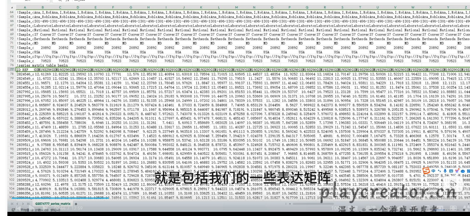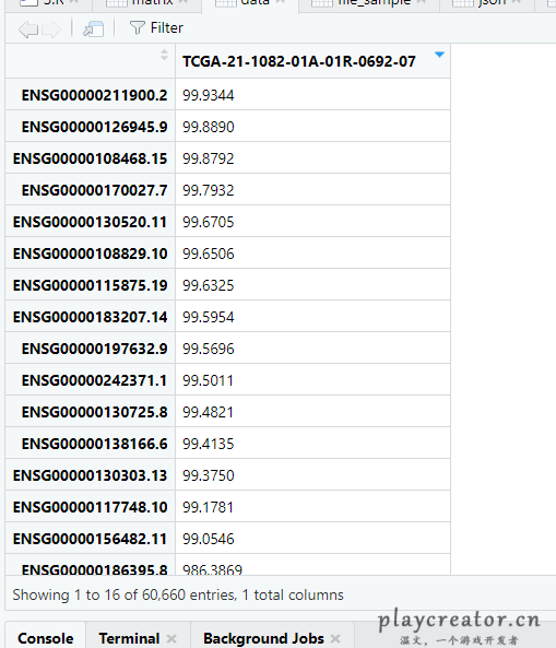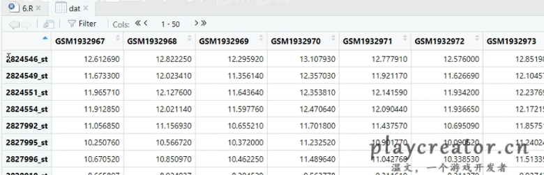 根据which查到的行号,可以提取到对应的样本名,并将样本名作为data列向量的列名。这样就可以得到列名为样本名,每行值为基因表达数据中的第6列的值。