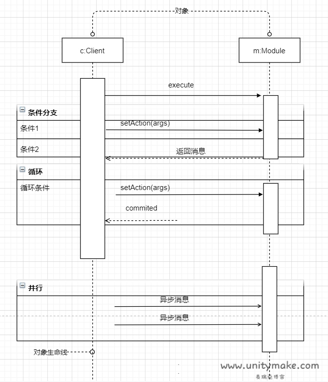 每个对象下有一条垂直的虚线,这就是对象的生命线,从上往下,代表时间的先后顺序。