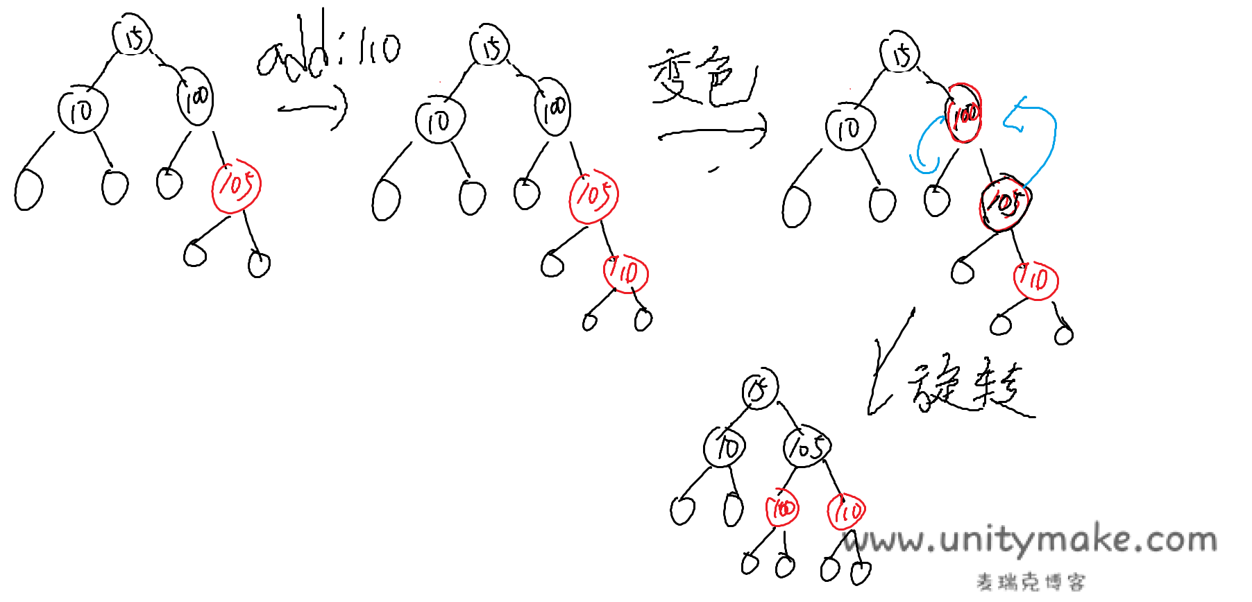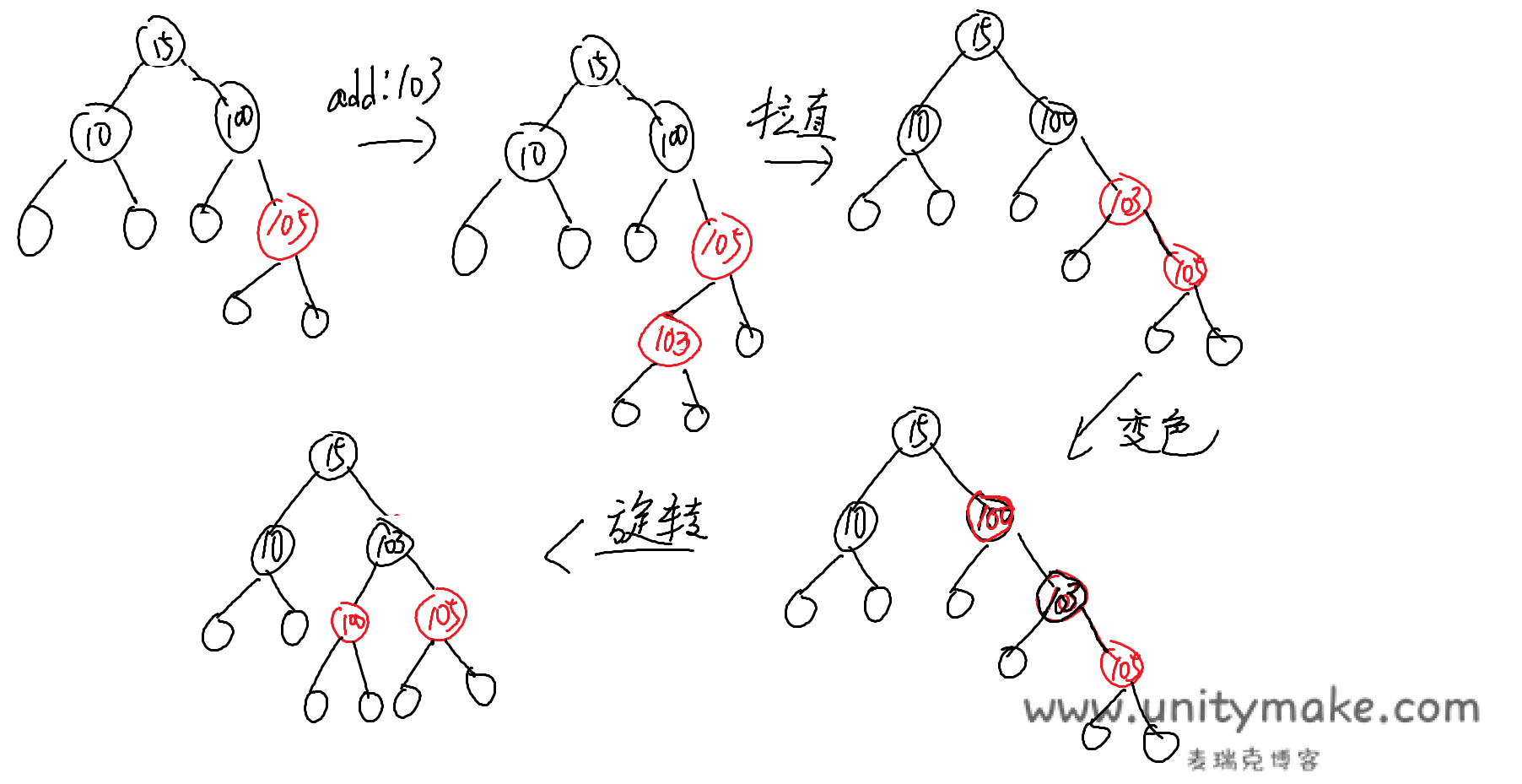 - 父为红,叔为黑。爷父变色再旋转。(旋转以确保第4条规则)