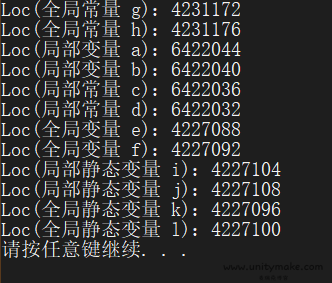 printf("Loc(局部静态变量 i):%d \n", &i);