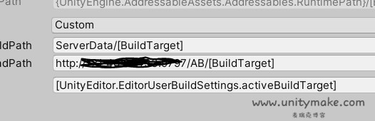 我们指定特定平台下的AB包是不同的,我们想要每个平台下都能从对应的地址去下载AB包,那么怎么办呢?其实可以制作多个profile指定不同的路径,对应的平台选择对应的profile。还有更方便的,addressable提供一个buildTarget插槽,它会获取编辑器当前所选的平台的名称,直接以这个名称作为后缀,这样就快了。