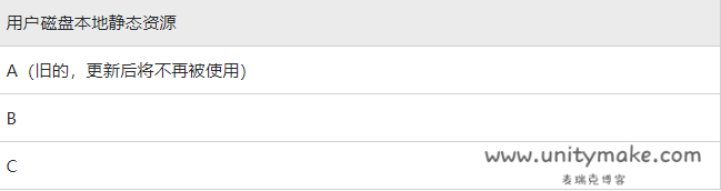 本地静态资源,用户将通过Content Update组,更新到新的A,而旧的A将存在磁盘里永远废弃掉。