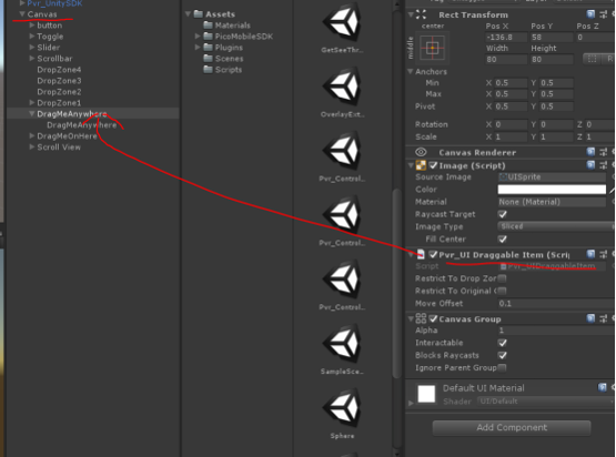 拖拽uiItem的组件:在要拖拽的物体上挂载Pvr_UIDraggableItem和CanvasGroup