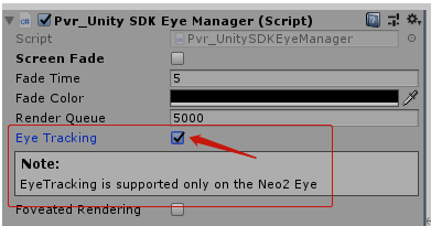 Pico Neo2 Eye设备支持眼球追踪, 眼球追踪可以追踪眼球注视位置,配合注视点渲染可以优化渲染性能。眼球追踪功能的开关在Pvr_UnitySDK中Head下,勾选Eye Tracking即可,如图: