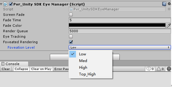 勾选Foveated Rendering后,会出现Foveation Level子选项,选择一个Level选项即可实现注视点渲染功能,无需开发者额外的编码。